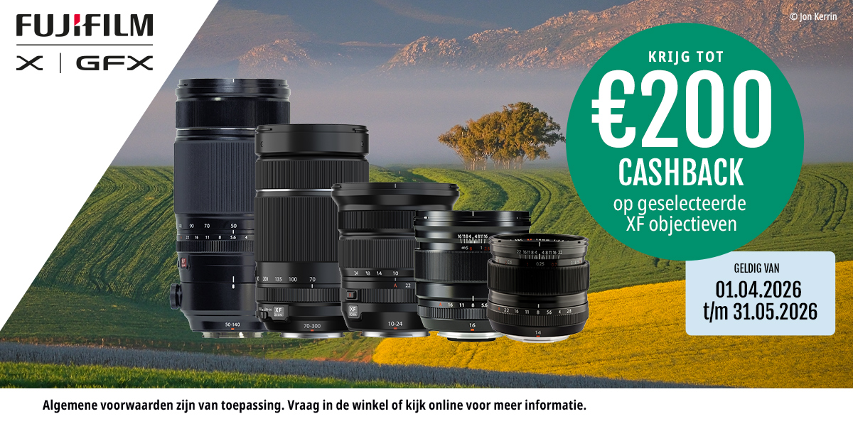Profiteer tijdens de actieperiode van 1 april tot en met 31 mei 2026 van €200,- cashback bij aankoop van een FUJIFILM XF actieproduct.